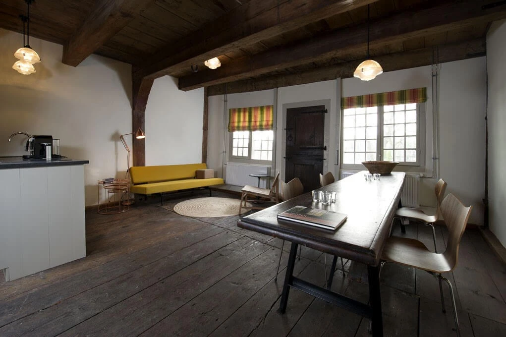 Nu bereikt u via de smalle 17e eeuwse spiltrap, het monument en bed appartement. hier vindt u een riante woonkamer met keuken en uitzicht over de haven, een slaapkamer en een moderne badkamer.