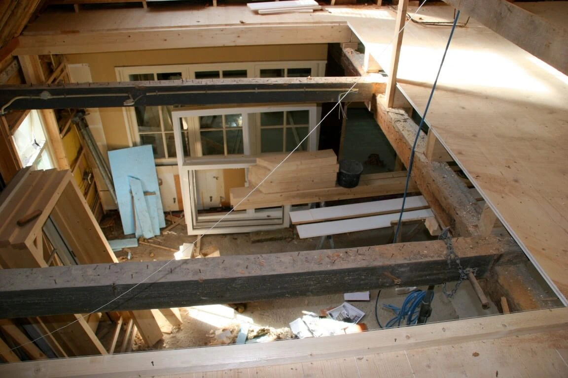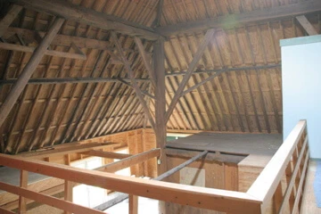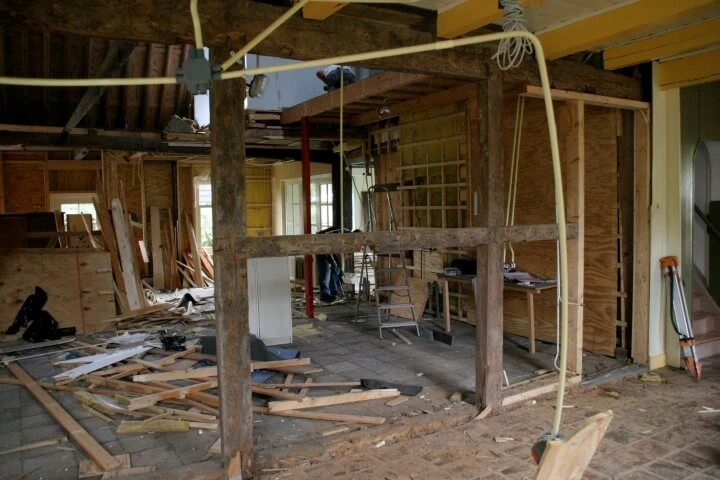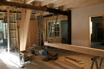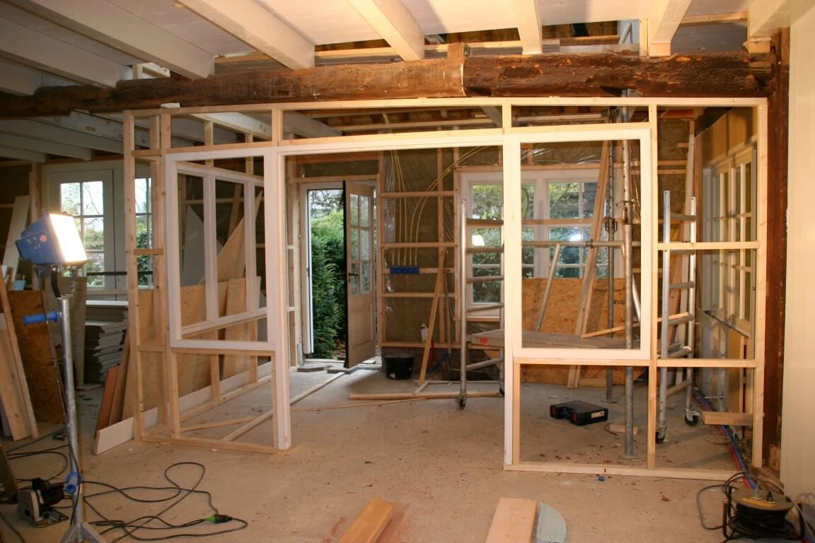 De nieuwe eigenaars wilden vooral een grote keuken. Gekozen is voor een aanbouw met een zadeldak dwars op het bestaande huis geplaatst. De welstandcommissie ging akkkoord met een houten zij- en topgevel. Romantiseren noemen ze dat. Tja..... Het was ook wel erg veel baksteen. Boven de keuken is een prachtige slaapkamer gesitueerd. De keuken is met de hand gemaakt door Frans Speijk (Speijk Interieur timmerwerk)